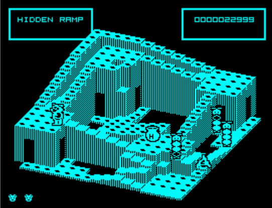 Outra coisa que gosto muito na versão do Spectrum – e que me decepcionou nas outras versões – é o visual do herói Bentley Bear. No Spectrum, ele é representado com traços “bonitinhos” e um olhar simpático. No arcade e nas demais versões, ele tem olhos pequenos e sem vida, é gorducho e está vestido como se fosse um travesti da floresta.