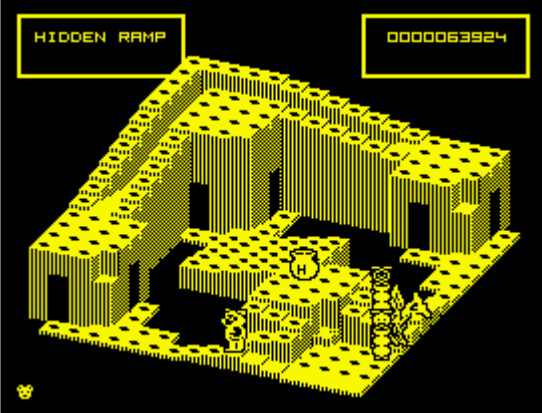 Além disso, é duvidoso que as cores tenham acrescentado algo ao jogo. Enquanto que o visual monocromático do Crystal Castles do Spectrum cria uma atmosfera sombria, as poucas cores do original do arcade parecem uma mistura de barro com “cor de burro quando foge”. A profusão de marrom, cinza, dourado e amarelo nas fases gera um visual meio “pesado” e cansativo, que prejudica até o próprio sprite de Bentley, que por vezes mais parece uma pessoa vestida de urso, bem distante daquele ursinho simpático do Spectrum. Por fim, o sinistro e intimidador fantasma que aparece pela primeira vez na terceira fase (“Doomsdome“) não existe no original do arcade, que apresentava um esqueletinho bobo em seu lugar.