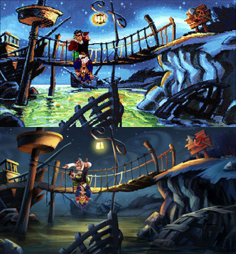 Mas a principal razão de eu estar falando sobre os dois primeiros Monkey Island aqui é a seguinte: em 2009, foram lançadas as SPECIAL EDITIONS de The Secret of Monkey Island e Monkey Island 2 (para Windows, Xbox 360, PS3, iPhone, iPod Touch e iPad). E o que essas versões oferecem em termos de melhorias não é pouca coisa. Primeiro de tudo, as novas edições especiais tiveram seus diálogos inteiramente dublados (os games originais, apesar das trilhas sonoras, não tinham vozes, apenas diálogos textuais). Segundo, os novos remakes apresentam gráficos redesenhados, em alta definição. Terceiro, contam com um mecanismo de “dicas” para que o jogador não fique preso nos puzzles mais complicados. Quarto, são 100% compatíveis com Windows Vista e Windows 7. Quinto (e melhor de tudo para os retrogamers), oferecem ao jogador o recurso de voltar para o visual original dos antigos games, apenas apertando uma tecla a qualquer momento do jogo.