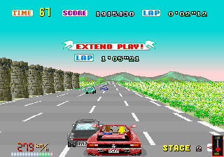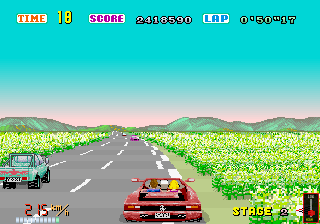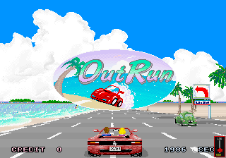 Para encerrar, existe ainda um outro motivo que foi importante para o sucesso do jogo (e também para a transformação dele em um ícone histórico dos games posteriormente), e esse motivo é óbvio para todo mundo que já jogou Out Run: a sensacional trilha sonora. Embora a composição das trilhas tenha seguido orientações dadas por Suzuki, o responsável direto pelas maravilhosas faixas do game é Hiroshi Miyauchi, que na época já era um compositor “da casa” da Sega. Out Run apresentava três faixas “in game”: Splash Wave, Magical Sound Shower e Passing Breeze – sendo que o jogador podia selecionar a música desejada para sua partida antes do começo do jogo. Uma quarta faixa (igualmente fantástica em termos de feeling), chamada Last Wave, tocava ao final da partida, na tela dos high-scores. Versões posteriores do game tiveram a adição de novas composições (a versão de Out Run do Mega Drive – de 1990 – tinha uma faixa extra chamada Step On Beat, e o Out Run 3D do Master System – de 1989 – tinha as faixas extras Color Ocean, Shining Wind e Midnight Highway).