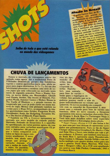 A seção de notícias da revista apresentava o lançamento do mais novo videogame da Dynacom, o Dynavision 3. Coincidentemente, naquele mesmo ano, meu melhor amigo daqueles tempos viria a ganhar um console desses, e nos anos seguintes nos esbaldamos jogando Super Contra, Batman – Return of the Joker, Battletoads, Kung Fu Master, Tartarugas Ninja III, Yo!Noid e outros!
