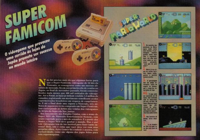 As páginas seguintes exibiam uma infartante reportagem sobre o Super Famicom, “o videogame que provocou uma corrida às lojas do Japão” e que “promete ser sucesso no mundo inteiro” (puxa, e eles não poderiam imaginar o quanto estavam certos sobre isso, não é mesmo?). Ao longo da reportagem, várias fotos e pequenas análises sobre alguns dos primeiros games do recém-lançado console da Nintendo: Super Mario World, Actraiser, Final Fight e Pilotwings. Era difícil imaginar que, menos de um ano depois de eu estar lendo aquelas páginas, o Super Nes já estaria tomando o mundo ocidental de assalto, hipnotizando todos os fãs de games do mundo na esteira do megasucesso de sua versão do Street Fighter II, sucesso absoluto dos arcades.