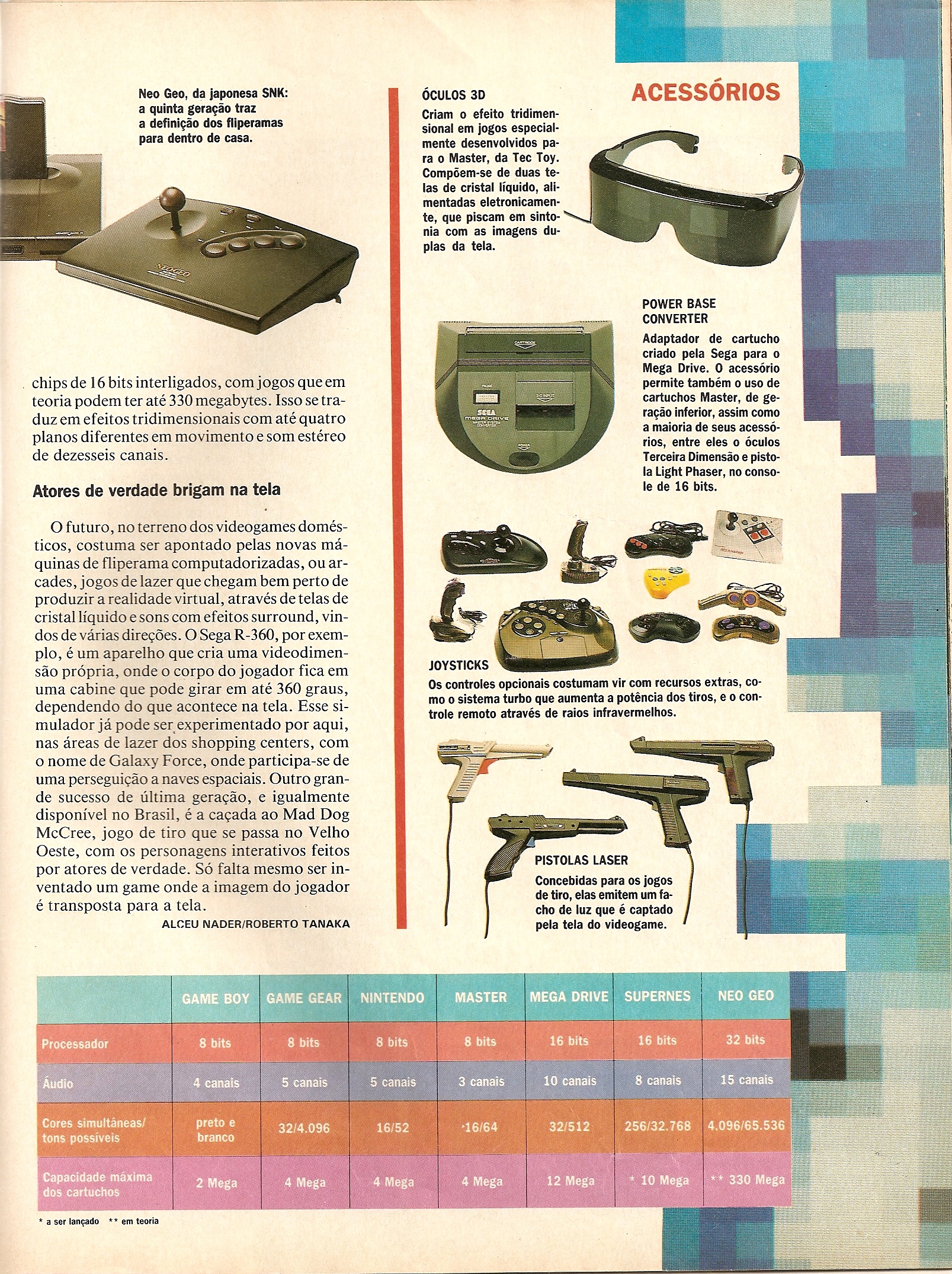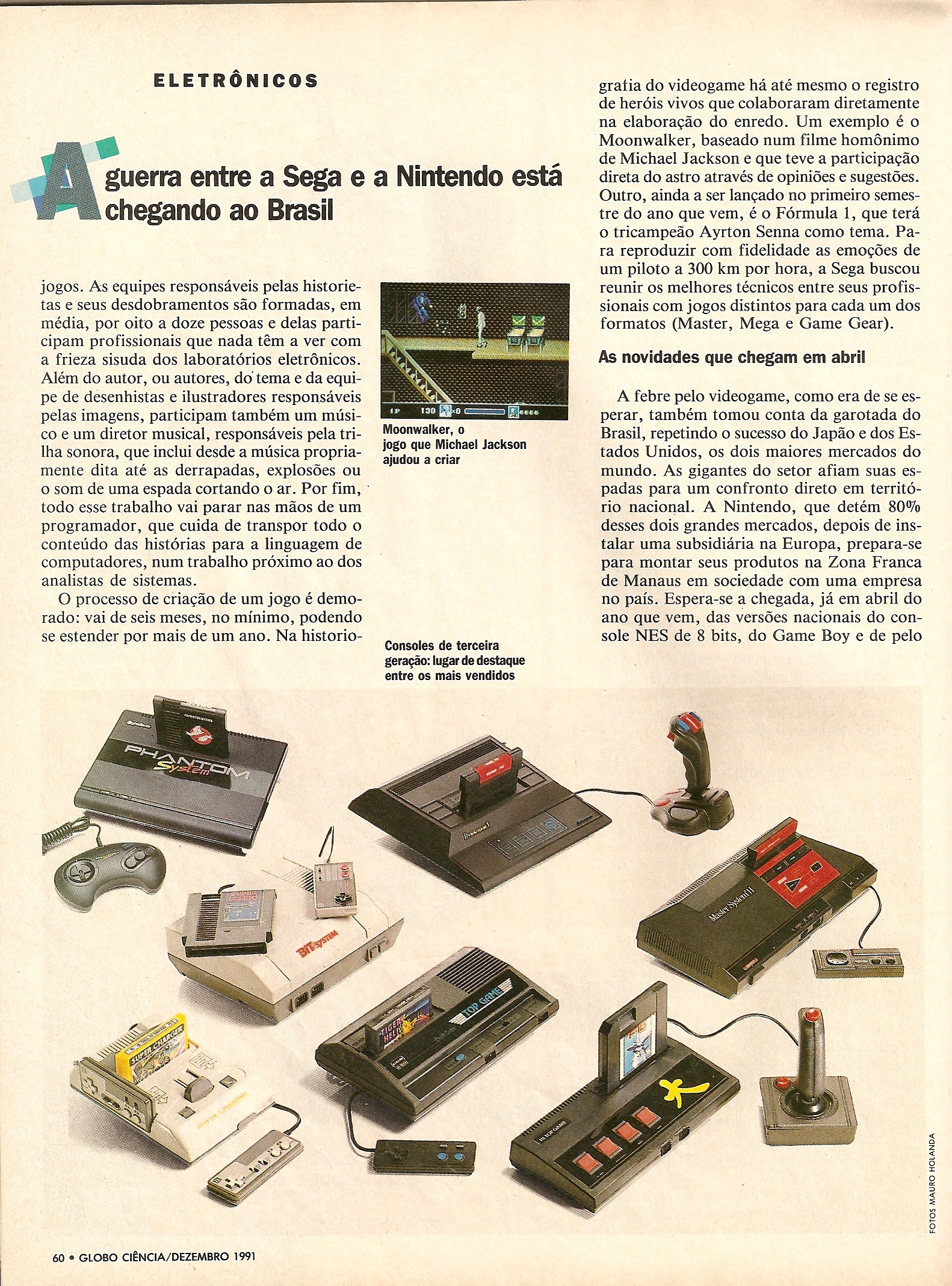 Para aqueles que acham que o NES repetiu por aqui a sua hegemonia verificada no resto do mundo, a reportagem nos ajuda a lembrar que “o Master System (…) permanece com a liderança das vendas entre os consoles de terceira geração“, e que “a dobradinha Sega-Tec Toy” detinha na época “70% do mercado nacional“. Eram os anos de ouro da boa e velha Tec Toy. Segundo a matéria, “com apenas três anos de vida, a Tec Toy firmou-se como a maior fabricante de games e jogos eletrônicos do país e hoje já é a segunda maior fabricante de brinquedos do Brasil, suplantada apenas pela tradicional Estrela“. Hoje, 19 anos depois, a Tec Toy encontra-se no lamentável estado que todos nós conhecemos, reduzida a uma marca sem qualquer importância e vivendo do passado, insistindo na constrangedora comercialização de réplicas vagabundas e simplificadas do Master System e do Mega Drive. Para quem viveu naquela época, é triste de ver …