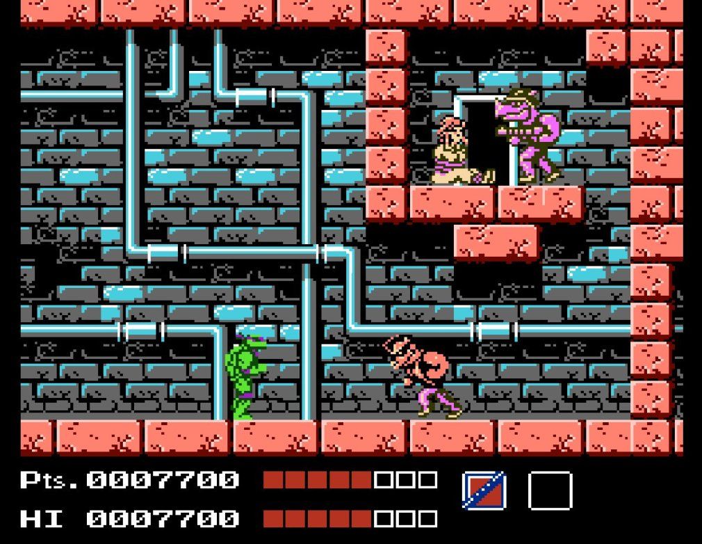 Hey, mas espera um pouco. O primeiro jogo das Tartarugas Ninja chegou às plataformas domésticas com o nome “Teenage Mutant Ninja Turtles II“? É isso mesmo. O negócio é o seguinte: enquanto que, nos arcades, o primeiro jogo das tartarugas foi o hoje cultuado beat’em up de 1989, nas plataformas domésticas a franquia debutou com um jogo totalmente diferente, embora igualmente desenvolvido pela Konami. Para confundir ainda mais as coisas, ele recebeu o mesmíssimo título do jogo do arcade: Teenage Mutant Ninja Turtles.