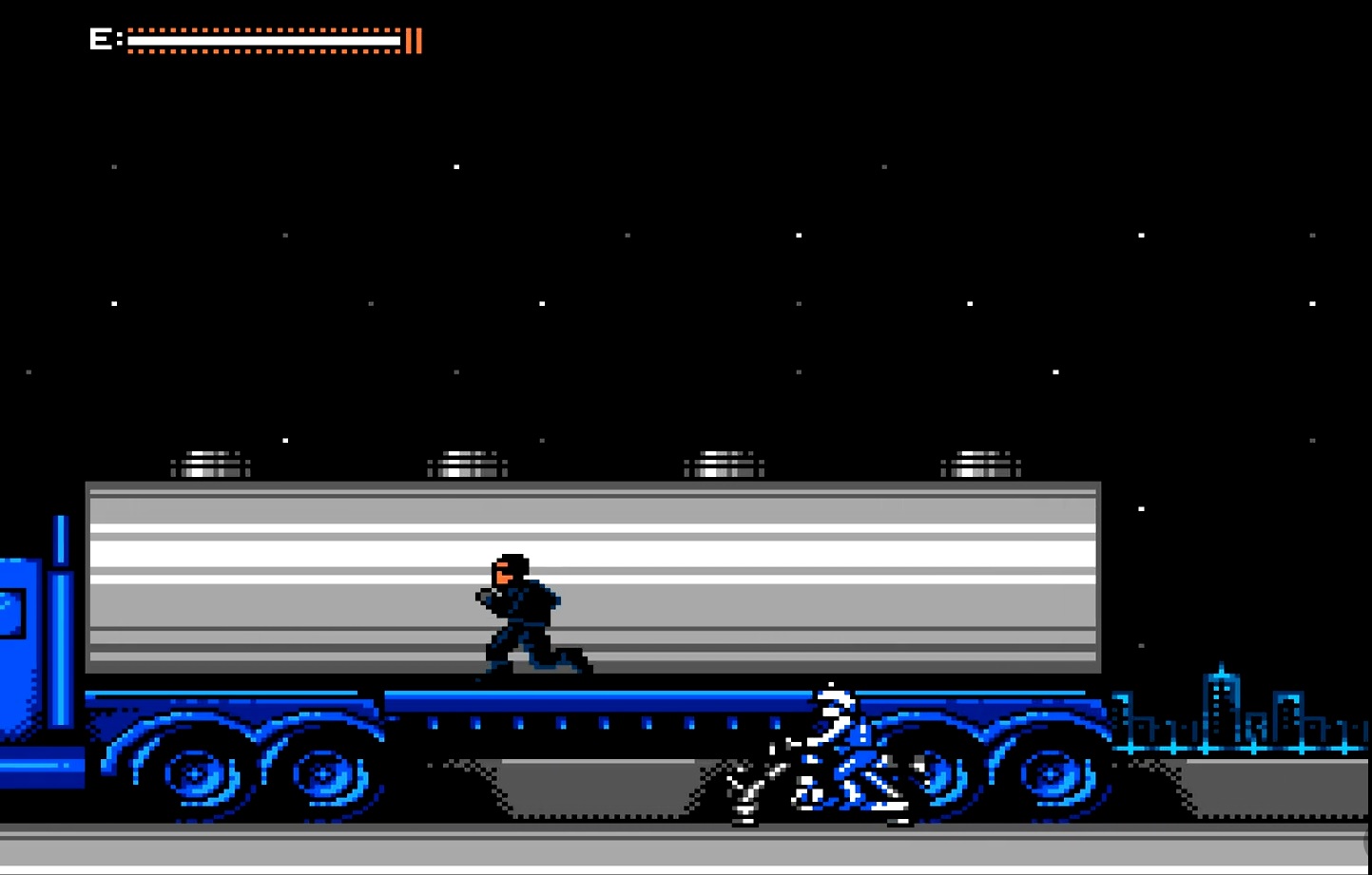 Fase 2: prepare-se para muitas frustrações nesta que é a fase mais difícil do game inteiro. O negócio aqui é manter o T-1000 (que está dirigindo o caminhão) afastado. Para fazer isso, é necessário atirar sem parar na direção dele toda vez que o vilão se aproximar. É bem mais complicado do que parece, porque você estará guiando sua moto em alta velocidade e o canal no qual você está pilotando é cheio de obstáculos (como restos de veículos destroçados, caixas e poças de óleo). Também é importante lembrar que, na hora de cruzar por baixo dos viadutos, é necessário atirar antes para abrir a passagem. Além disso, é preciso passar pelo espaço aberto com bastante precisão. Qualquer colisão de um centímetro para um lado ou outro significará perda instantânea de uma vida. Prepare sua paciência: você irá morrer MUITAS E MUITAS VEZES nessa fase frustrante até dominá-la. Mas calma aí que nem tudo são más notícias. Em primeiro lugar, vale observar que a fase não é muito longa. Em segundo lugar, fique atento para o fato de que o único continue do jogo aparece rapidamente nesta fase. Botar as mãos nesse continue basicamente duplica suas chances de conseguir chegar ao final desse game sem recorrer a cheats (eu usei Game Genie e não estou nem aí hehehe).