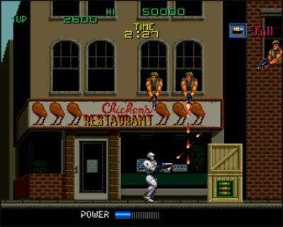 De cara, a primeira coisa que chama a atenção é que o design de fases voltou a se preocupar com a criação de um ambiente urbano violento e intimidador, capaz de reproduzir no game a atmosfera dos filmes do Robocop. É uma coisa que havia se perdido por completo nas adaptações para videogame de Robocop 2, que apostaram em ambientes fechados e cenários genéricos e sem graça. De imediato, também, chama a atenção o visual do personagem (muito melhor desenhado do que no Robocop 2 do NES) e a movimentação precisa do personagem. É um grande avanço em relação ao Robocop 2 do NES, no qual o personagem derrapava e escorregava mais do que caminhava. Naquele game, o jogador tinha a sensação de estar controlando um Robocop com cascas de banana amarradas nos pés …